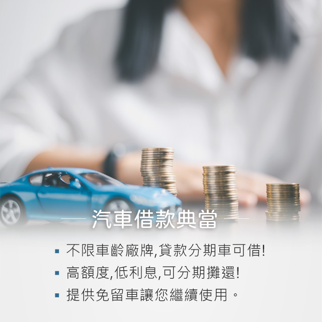 汽車借款,是緊急需要用錢的首選,借款條件簡單,只要你年滿20歲,名下有汽車、攜帶雙證件和行照,當舖就能直接幫你辦理相關借錢手續。汽車借款是一種便利又快速的週轉方式,很適合有小額資金短缺的朋友們使用,並提供汽車借款免留車的服務,不會因為使用汽車借款而影響到原本生活及交通。